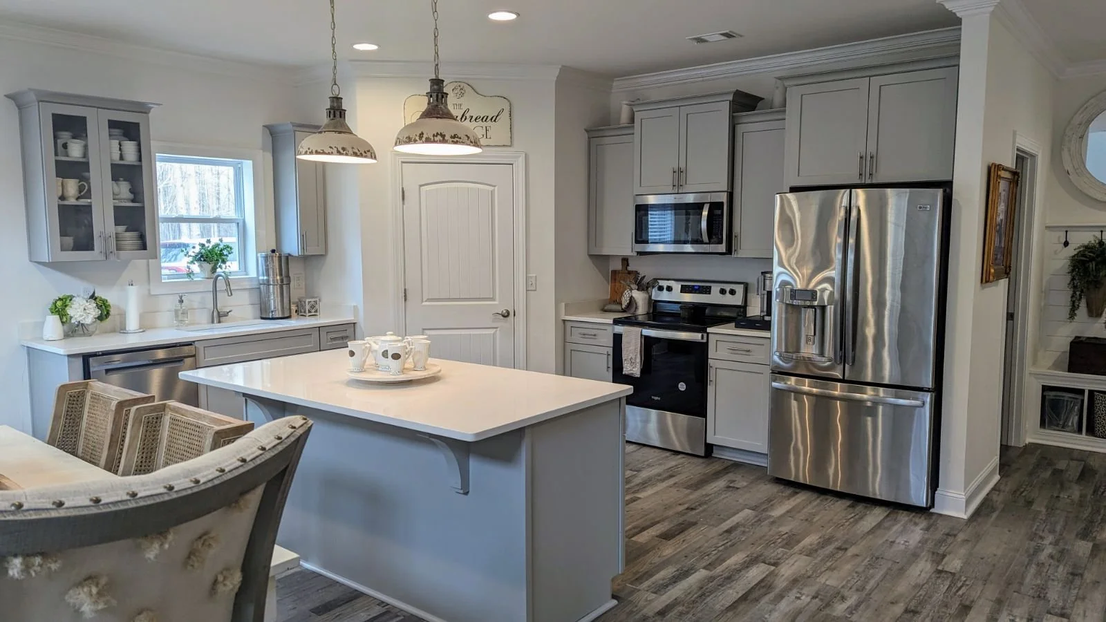 This modern 2-story farmhouse has 4 bedrooms, 3 bathrooms, and blends contemporary design with rustic charm. The open main floor features a bright living area, a kitchen with high-end appliances, and a dining space. The primary bedroom includes an en-suite with dual vanity, soaking tub, and walk-in shower. Upstairs bedrooms share a full bath. Exterior elements like a covered porches enhance its farmhouse appeal with modern modern living. The open layout creates an inviting atmosphere, ideal for entertaining friends and family. The quiet master suite features a stylish, private bathroom, offering a peaceful retreat. Additional bedrooms provide ample space, perfect for guests or family members. The living area seamlessly combines the kitchen, dining, and living spaces, all brightened by natural light streaming through the many windows.